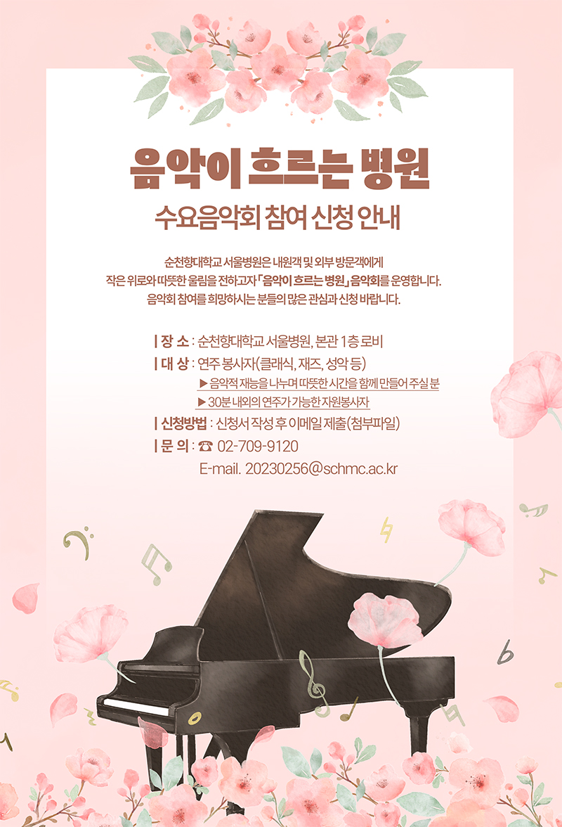 「음악이 흐르는 병원」음악회를 개최하오니, 참여를 희망하시는 분들의 많은 관심과 신청 바랍니다.
