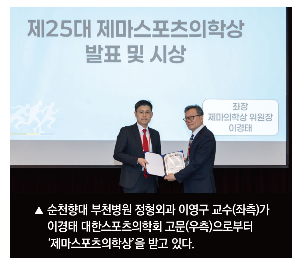 이영구 순천향대 부천병원 정형외과 교수가 최근 열린 ‘대한스포츠의학회 제68차 춘계학술대회’에서 최우수 논문상인 ‘제마스포츠의학상’을 수상했다고 30일 밝혔다.